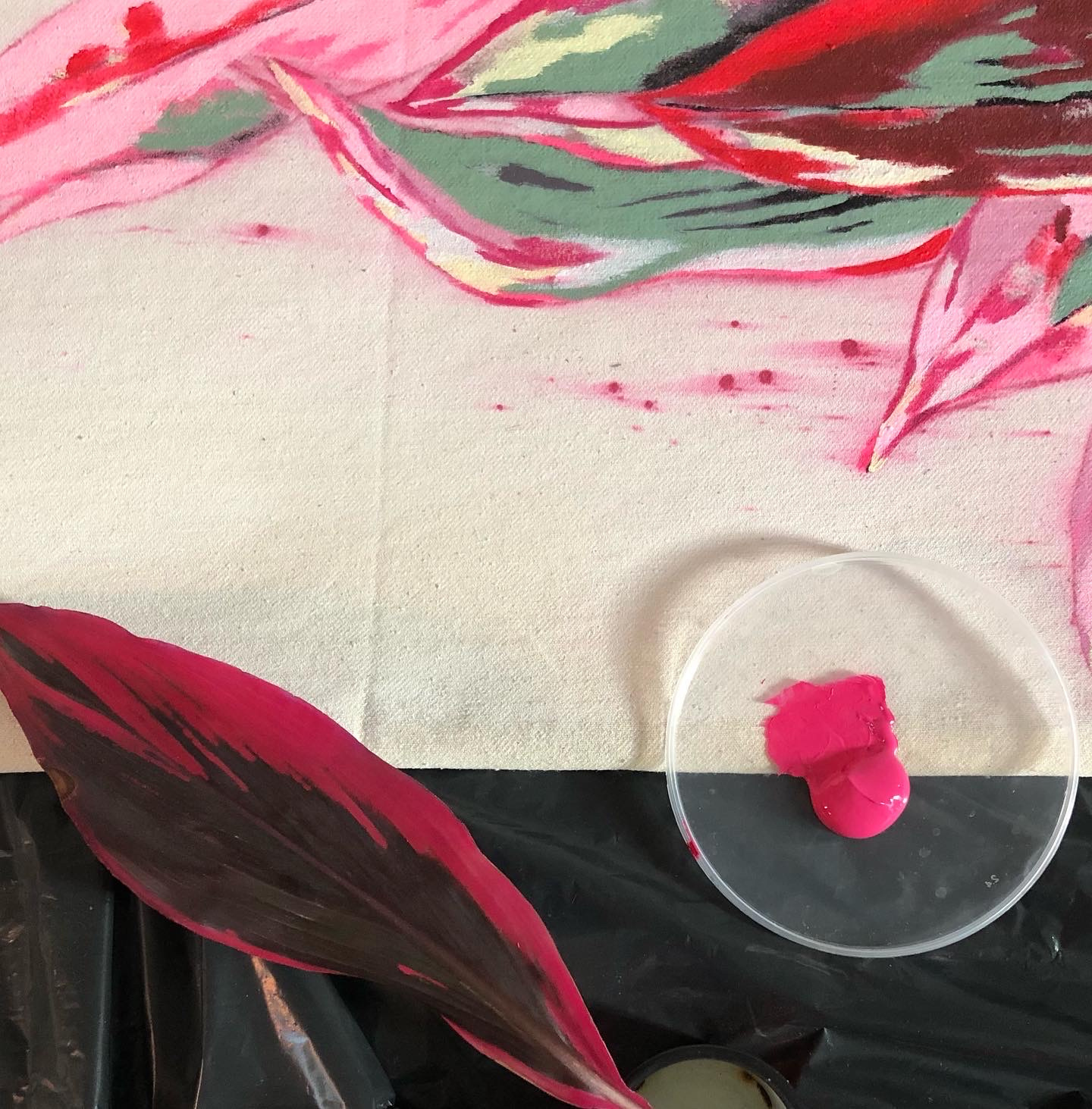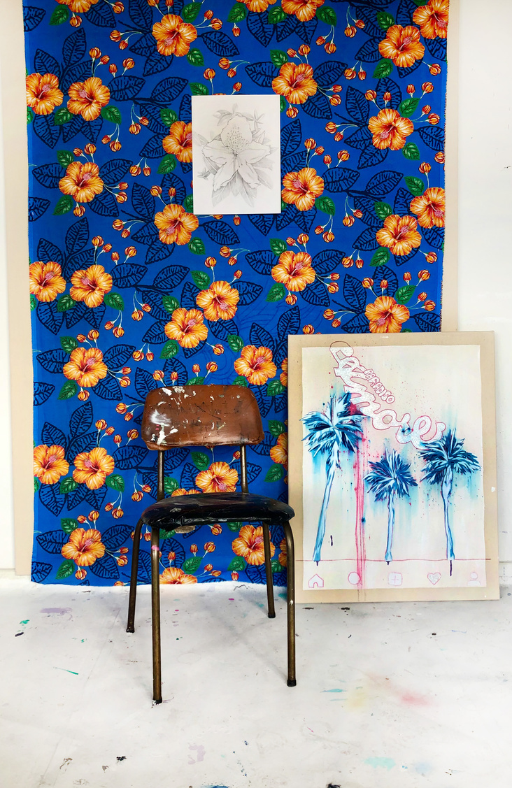 I'm Caroline Corleone, a visual artist based in Berlin working at the intersection between recontextualized digital textile patterns, Computer-Generated Imagery and analog painting. I combine materials such as pattern/fabrics or ready made objects with specific painting strategies. I create works that are colourful hand-sewn mixed media pieces or installations. I'm interested in contemporary challenges, deep-diving into botany and its connection with colonial